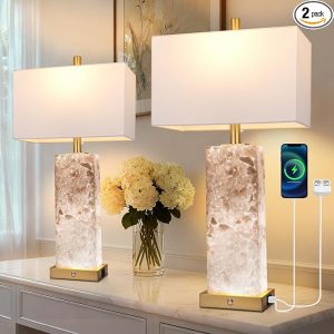 2-Pack 25.6″ Alabaster Lamps, Marble Lamphttps://beddybyefurniture.com/?post_type=product&p=3743&preview=true Nightstand Lamps Set of 2, 3-Color Temperatures Bedside Lamps with Nightlight, Modern Table Lamp with USB Ports for Living Room Bedroom Hotel, Bulbs Included