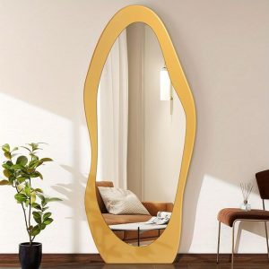 Full Length Mirror Gold Wooden Full Body Mirrors 59″x24″ Irregular Wavy Mirror Full Length Floor Mirror for Cloakroom Bedroom Living Room