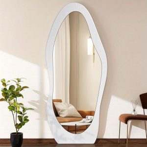 Wavy Mirror Wooden 59″ x 24″ Floor Mirror Full Length White Irregular Full Body Mirrors for Bedroom Cloakroom Living Room Entryway Hall