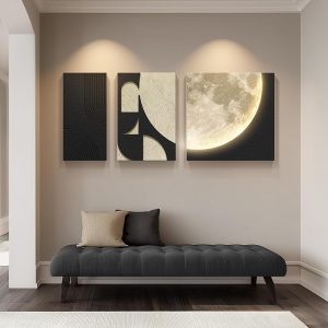 3D Textured Black and White Abstract Wall Art with LED Lights Moon Design, 3 Piece Modern Wall Paintings Artwork for Walls, Minimalist Neutral Black Beige Wall Decor for LIving Room, Hallway, Bedroom