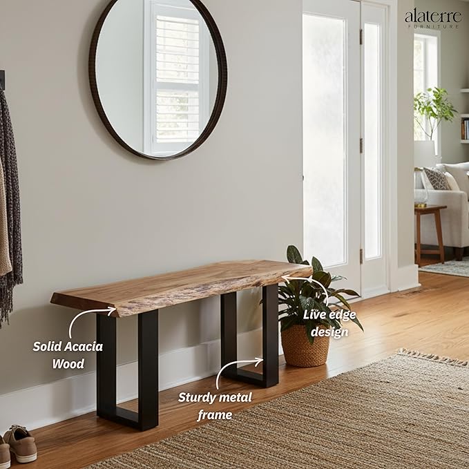 - PREMIUM QUALITY – This entry bench is made of solid acacia wood with a live edge for rustic charm, while the metal legs ensure increased structural durability for years of continued use and boast a durability to support a total weight of 300lbs.
