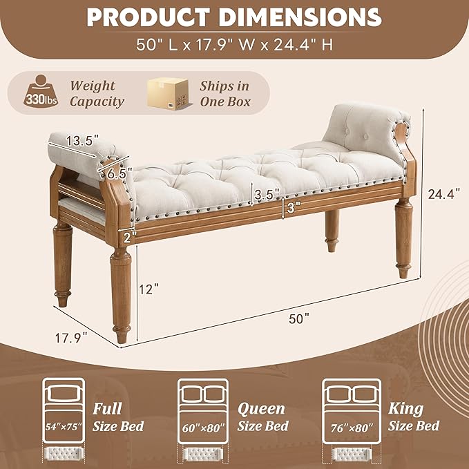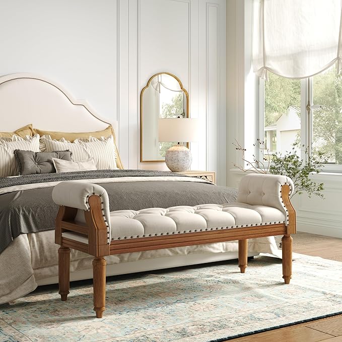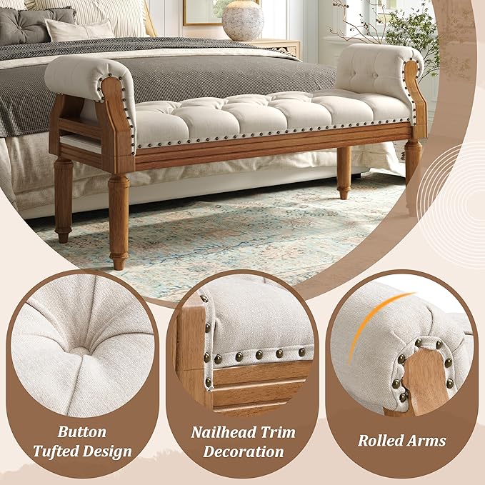 Christopher Knight Home Yordle Button-Tufted Linen Upholstered End of Bed Ottoman, Wooden Living Room Ottoman Bench with Nailhead Trim, Long Entryway Bench with Rolled Arms, Beige + Brown