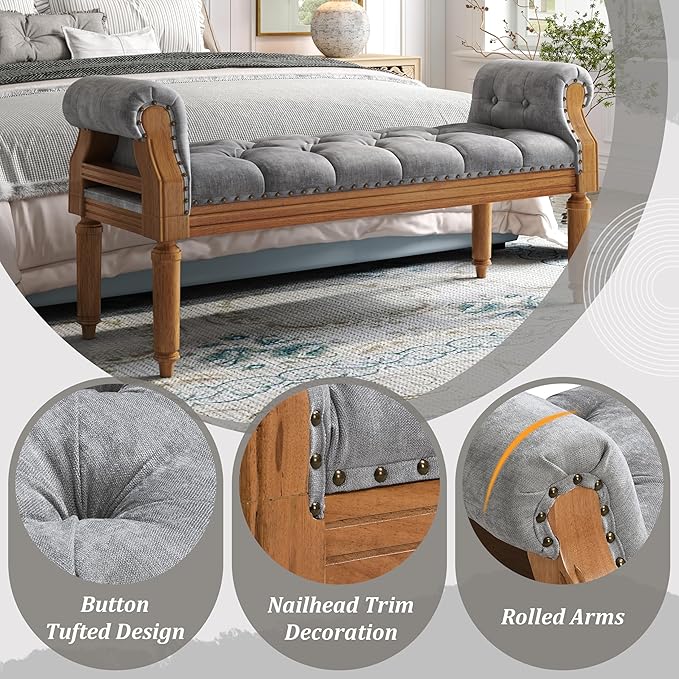 Christopher Knight Home Yordle Button-Tufted Linen Upholstered End of Bed Ottoman, Wooden Living Room Ottoman Bench with Nailhead Trim, Long Entryway Bench with Rolled Arms, Gray + Brown