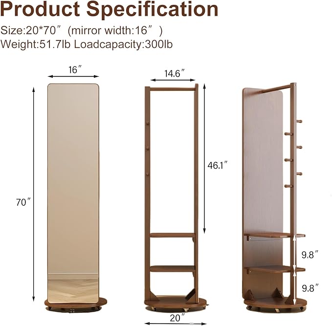 - 【TWO-IN-ONE DESIGN】 This floor mirror with stand integrates a rolling coat rack, shelves, and a standing mirror, saving space while being ideal for bedrooms, living rooms, hallways, and clothing stores, etc.