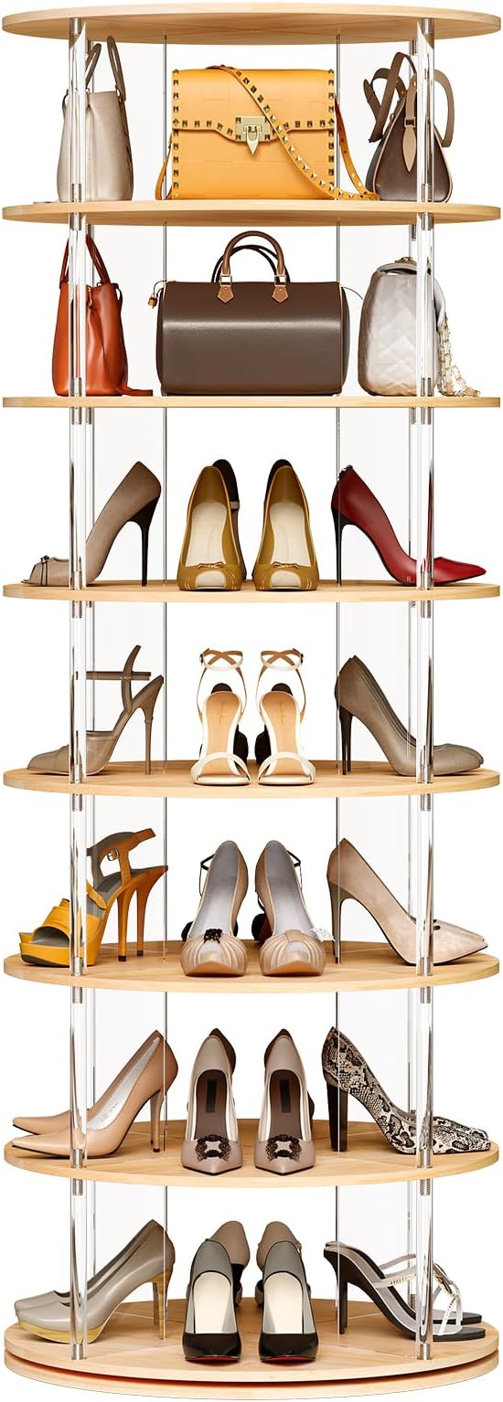 - STYLISH CLEAR ACRYLIC DESIGN: Crafted from sturdy wood and durable acrylic, this rotating shoe rack tower blends seamlessly into any decor, adding a modern touch to your home. Whether it’s shoes, handbags, or hats, it can handle all with style. The structure is designed to withstand the test of time, ensuring this shoe carousel remains a beloved part of your room for years to come. You’ll appreciate its stability and see-through appearance which’s great for organization.
