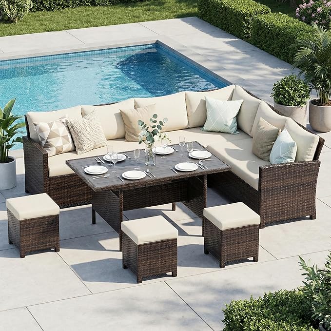- 【Strong Construction & Premium Wicker】Constructed of a heavy-duty powder-coated steel frame and premium wicker rattan, this 7 piece outdoor patio furniture set is durable and sturdy enough to resist changes in weather for years of use. Furthermore, all of the sofas and tables have anti-slip pads to protect the floor while improving stability.